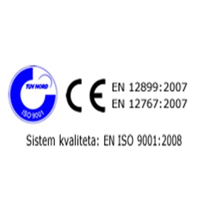 Ker delamo s kakovostnimi materijali, imajo vsi naši znaki oznako CE, kar predstavlja usklajenost s standardi EN-12899:2007, EN-12767:2007 in sistem kvalitete EN ISO-9001:2008.