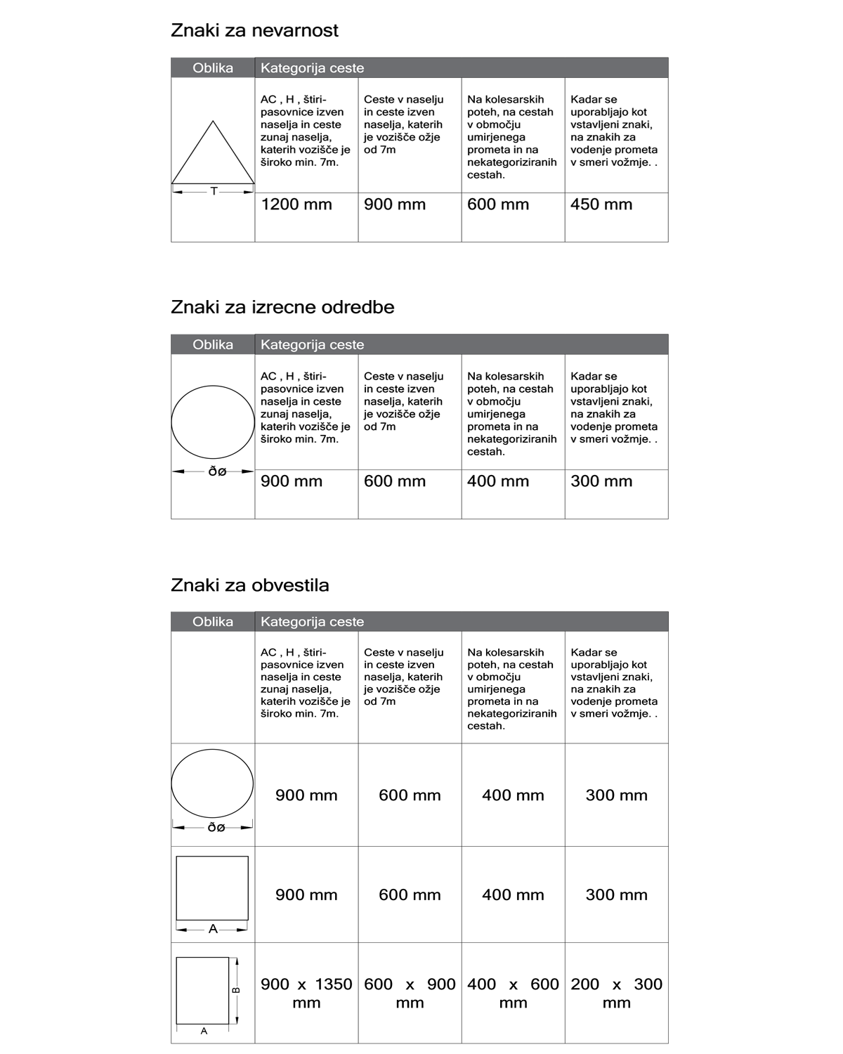 Pregled dimenzij znakov